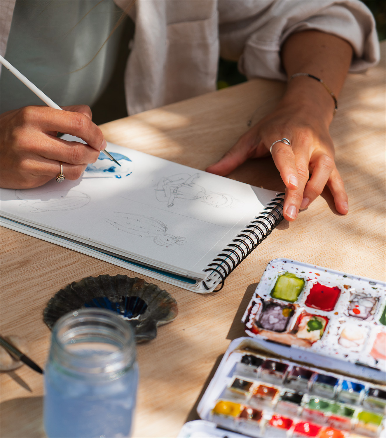 Malen war für mich schon immer viel mehr als nur ein Hobby; es ist meine ganz persönliche Art, mir Freiräume zu schaffen und mich vom Alltagsstress zu erholen. Schon als Kind fand ich im Malen einen wertvollen Ausgleich zum Leistungsdruck in der Schule. Es war meine kleine Ruheinsel, auf der ich durchatmen und meiner Fantasie freien Lauf lassen konnte. Das Spiel mit den Farben und das Formen meiner Ideen auf dem Papier ist wie ein kreativer Tanz, bei dem ich mich schon immer am besten selbst wiederfinden, entspannen und ausdrücken konnte. Diese kostbaren Momente der Ruhe und Selbstreflexion sind in unserer schnelllebigen, medienbestimmten Welt ein wahres Geschenk. Auch heute entdecke ich durch das Malen immer wieder neue Welten und Perspektiven im Innen und Außen – und finde dadurch gleichzeitig wohltuende Ruhe.
